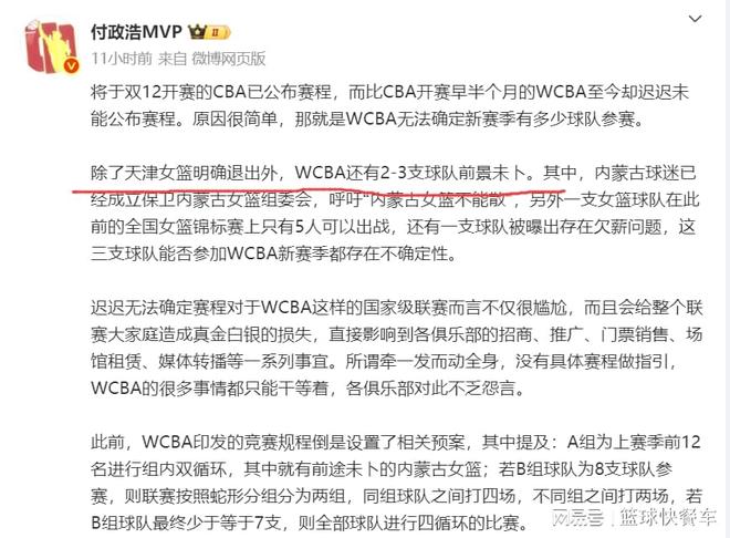事实上,在过去两年,WCBA女篮联赛一直存在不少问题。而在今年夏天,就有消息传出天津队和内蒙古队将退出WCBA联赛。目前,已经确定的是天津队已经确定退出外,还有2-3支球队,他们也在考虑退出WCBA联赛。这其中还包括内蒙古女篮。要知道,他们可是联赛的顶级强队,上赛季还是争冠热门球队,也打进了WCBA半决赛,可即便如此,内蒙古还是去意已决。