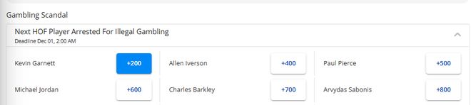 作为名人堂成员的比卢普斯已经被捕,谁会是下一位被捕的名人堂球员?目前赔率显示,加内特(+200)高居榜首,赔率排在他后面的依次是艾弗森、皮尔斯、乔丹、巴克利和萨博尼斯。