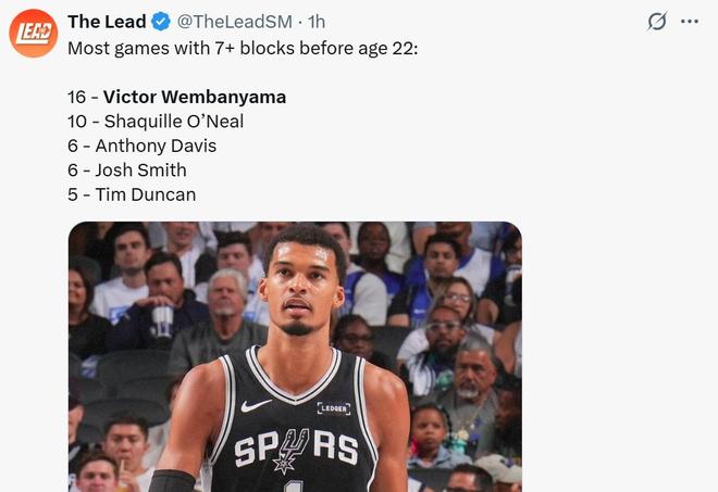 凭借这样的表现,文班亚马继续刷新NBA历史纪录,已经16次单场至少送出7次封盖,刷新22岁以前球员在该表现上的历史最佳纪录。