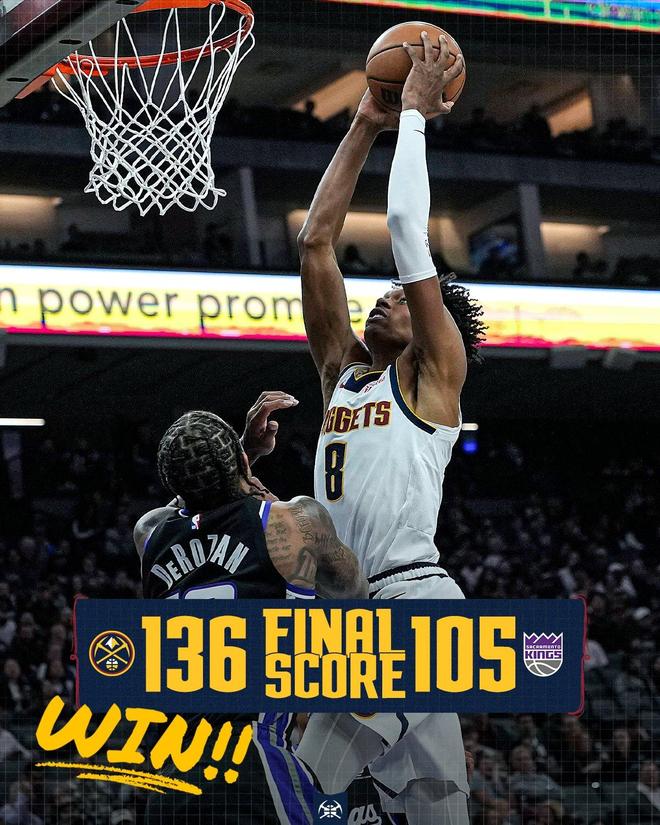 末节决战,掘金替补席在场上与对手周旋,丹佛延续着火热的手感,得以将分差扩大至37分,国王队追分乏力,比赛早早失去了悬念。两队开始在场上练兵,时间逐渐走完。最终,丹佛以136比105完胜对手,就此实现了4连胜。掘金在客场豪取11连胜,继续刷新队史纪录。
