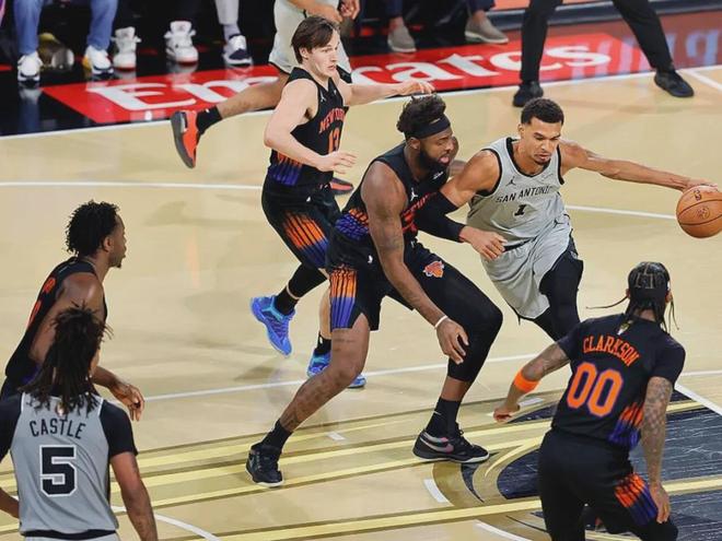 布朗森这场效率也不咋地,重心还是在扛产量,亮点则是几次躲护筐的近筐出手。面对马刺两个2.2米的长人,尼克斯这场展现了油漆区抛投、小跳投的艺术,几个后卫在这个区域的表现都很硬核。名不见经传的科勒克尤为惊喜,打得冷静而高效。