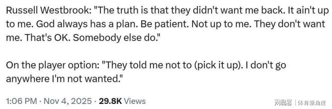 一直以来,都有人对威少今夏休赛困惑。他2025 -2026赛季价值347万美元的球员选项,离开了原本效力的掘金队,转而加盟了一支争冠希望渺茫的国王队,且只能拿到无保障底薪。这一系列操作,确实让人难以理解。据威少本人透露,是掘金队并不希望他回归,而他自己也不愿意待在一个不需要自己的队伍中,因此双方最终分道扬镳。