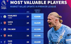英超球员身价更新:哈兰德涨至2亿欧,萨卡降至1.3亿欧