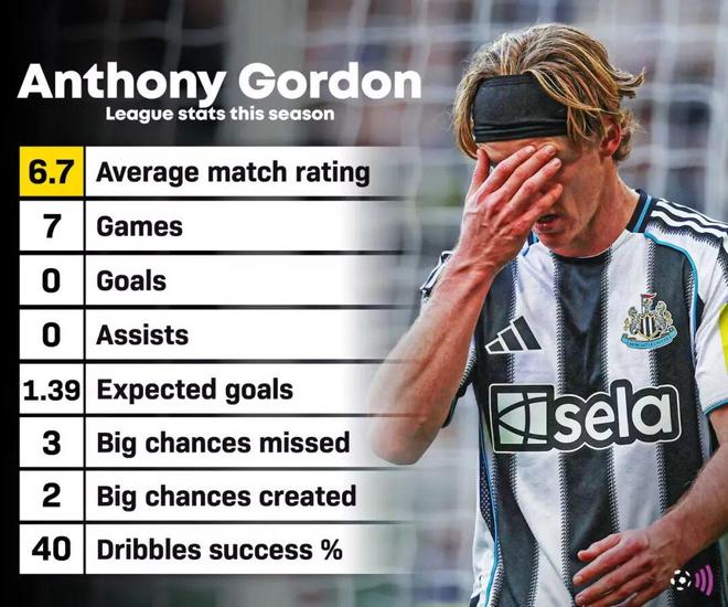 戈登在2023年冬窗从埃弗顿转会至纽卡斯尔,初期表现积极,给球队带来了速度和活力。然而,他的终结能力和决策力一直备受质疑。本赛季他的进球荒尤其刺眼,尤其是在球队急需进攻火力的时候。他在联赛中缺乏直接贡献,使得纽卡斯尔的进攻效率大打折扣。尽管他在欧冠中展现了不同的面貌,连续三场比赛都有进球,但这反而加剧了外界对他在英超中“隐身”的质疑。