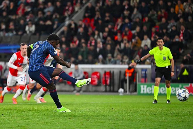 第35分钟,戴上队长袖标的萨卡操刀主罚,球速快角度刁,门将判断正确也无济于事,枪手取得领先,这也是萨卡本赛季欧冠的第2个进球。