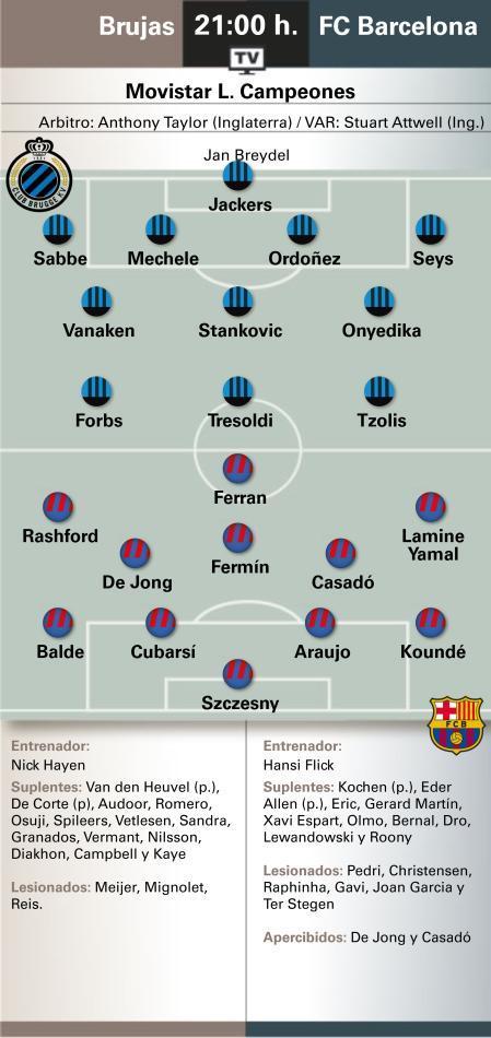 北京时间明天凌晨4点,巴萨将迎来欧冠联赛阶段第4轮客场对阵布鲁日的比赛,赛前,《世界体育报》对双方的首发阵容进行了预测。