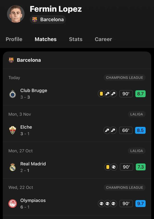 本赛季,奥尔莫状态不佳、伤病频繁,费尔明再次抓住机会上位。过去4场比赛,费尔明全部首发出场。欧冠6-1大胜奥林匹亚科斯,费尔明上演帽子戏法;国家德比客场面对皇马,费尔明打入挽回颜面一球;西甲3-1击败埃尔切,费尔明助攻双响。本轮欧冠,费尔明先是助攻费兰·托雷斯打入早早扳平的一球,下半场又助攻拉明·亚马尔将比分扳为2-2。