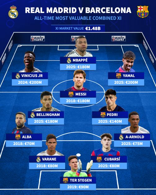 雷速体育10月24日讯 近日,德国《转会市场》基于球员在效力皇马与巴萨期间的巅峰身价,盘点了两队史上最昂贵的梦幻11人阵容,总身价高达14.8亿欧元。