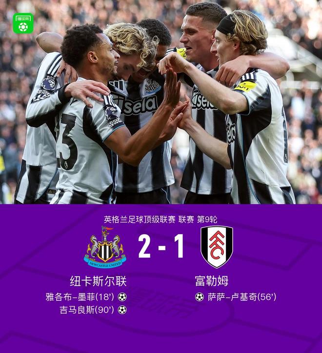北京时间10月25日,英格兰足球超级联赛第9轮,纽卡斯尔联坐镇主场迎战富勒姆。比赛中,雅各布-墨菲率先为纽卡斯尔联打破僵局,取得领先。随后,萨萨-卢基奇为富勒姆扳平比分,双方一度陷入胶着。临近比赛结束,吉马良斯挺身而出,攻入制胜进球。最终,纽卡斯尔联以2比1战胜富勒姆。