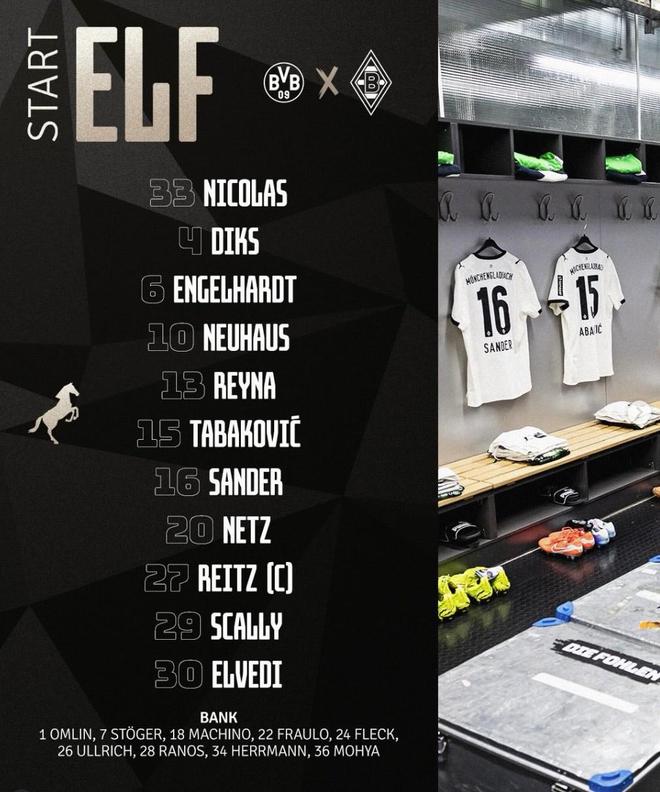门兴首发:33-尼古拉斯、4-迪克斯、30-埃尔维迪、29-斯卡利、20-内茨、27-赖茨、13-雷纳、10-诺伊豪斯、6-恩格尔哈特、16-桑德尔、15-塔巴科维奇