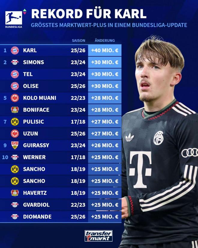 北京时间12月19日,德转更新了德甲球员的身价,拜仁慕尼黑17岁新星伦纳特-卡尔身价暴涨4000万欧元,从2000万欧元跃升至6000万欧元。根据德转官方的统计,伦纳特-卡尔也就此成为了自他们2004年开始引入球员身价数据以来,德甲历史涨幅最高的球员。